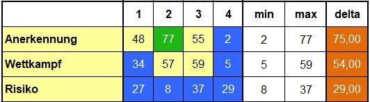 Auffällig ist, dass insbesondere bei dem Motiv Anerkennung die Unterschiede (Delta) hoch sind. 77 als höchster und 2 als niedrigster Wert. Der eine braucht viel Anerkennung / Lob von außen und der andere wenig, er ruht in sich selbst. Beide sehen die Welt komplett anders. Das führt häufig zu Verurteilungen des Gegenpols. "Du Sensibelchen" sagt der eine, "Du Holzklotz" der andere. Das passiert besonders, wenn die Teammitglieder unter Stress stehen, z. B. Termindruck.